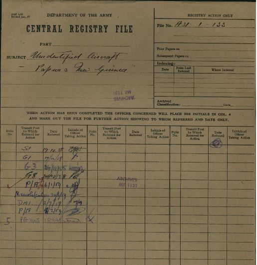 1. “Unidentified aircraft Papua and New Guinea” file series MT1131/1 control symbol A31/1/133, date range 1958-1959, owned by the Department of the Army.