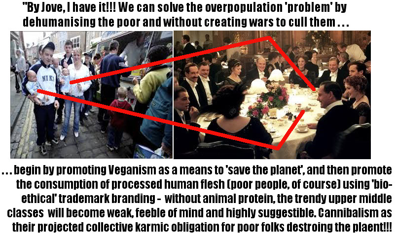 As all these bullshit, but potentially genocidal (upper middle class and beyond) trendy agendas all overlap among people with the highest incomes – while poor people are increasingly being dehumanised by the aristocrats using their mainstream media – one has to wonder how long it will be before the Vegan Feminists in the Cambridge Social-Workers Party, Anti-Nazi League will be dining on Chav Le Vin before they set off to their next ‘equality and inclusiveness’ march?