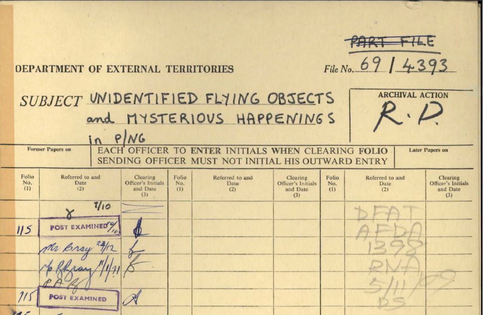 In a recent post (click here) about “Unidentified Flying Objects and mysterious happenings in Papua New Guinea,” I mentioned that a number of papers on National Archives of Australia (NAA) file series A452 control symbol 1969/4393, were missing according to a count of the folio numbers. These papers amounted to almost 20% of the file I received from the NAA.