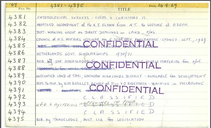 The scanned card, lists files in the series 69 4381-4395. Control symbols 4392, 4393, and 4394 are all originally “classified” with no file titles showing. However, for 4393 the word “classified” has been crossed out and the words “UFO & mysterious happenings in PNG” have been written in.