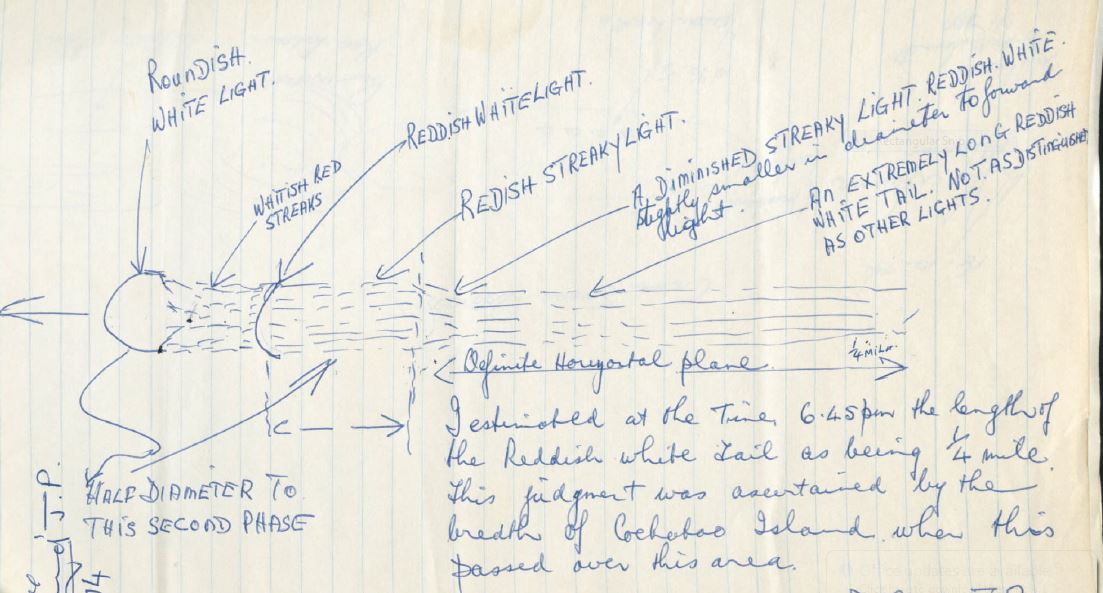 Lind’s handwritten statement tells that on 14 October 1974 at 1845hrs he was looking SE from Cockatoo island, and saw “..a circular bright light travelling towards the Island.” It was travelling fast, horizontally, until it disappeared behind land north of the powerhouse, approximately 15 miles NE of them towards Koolan Island. There was a oozing tail behind the object which was of a reddish-white colour. Behind the white front circular light was a white tail which turned to a reddish-white tail.